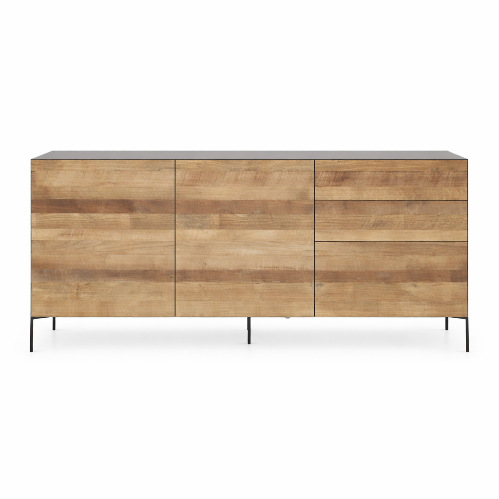 Aparador Fusion madera de teca reciclada con 2 puertas y estantes interiores, 3 cajones y un contenedor.