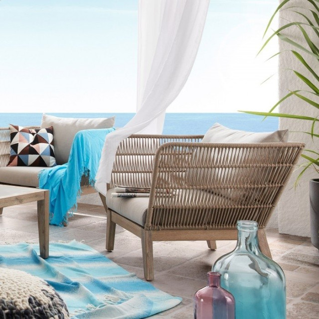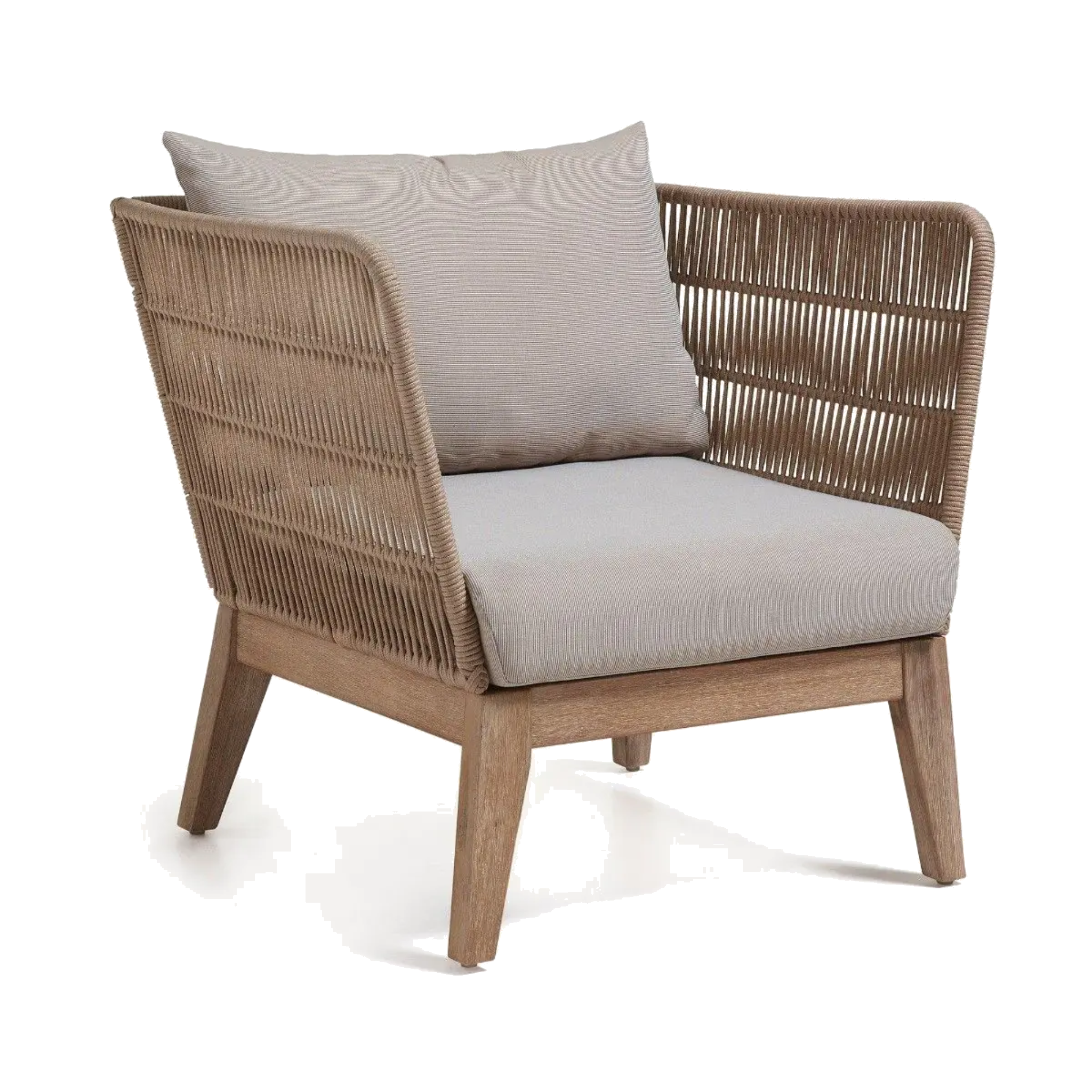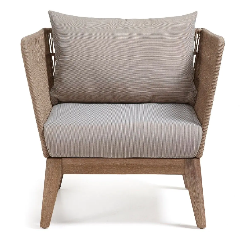Butaca de exterior Bell en cuerda y madera natural – Diseño contemporáneo y confort duradero