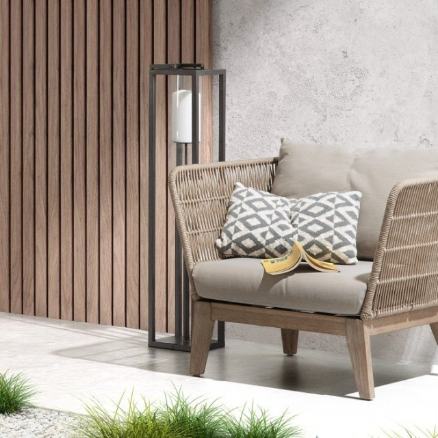 Apta para exterior bajo cubierta. Se aconseja protegerla de la exposición directa y prolongada a la intemperie para preservar sus materiales.