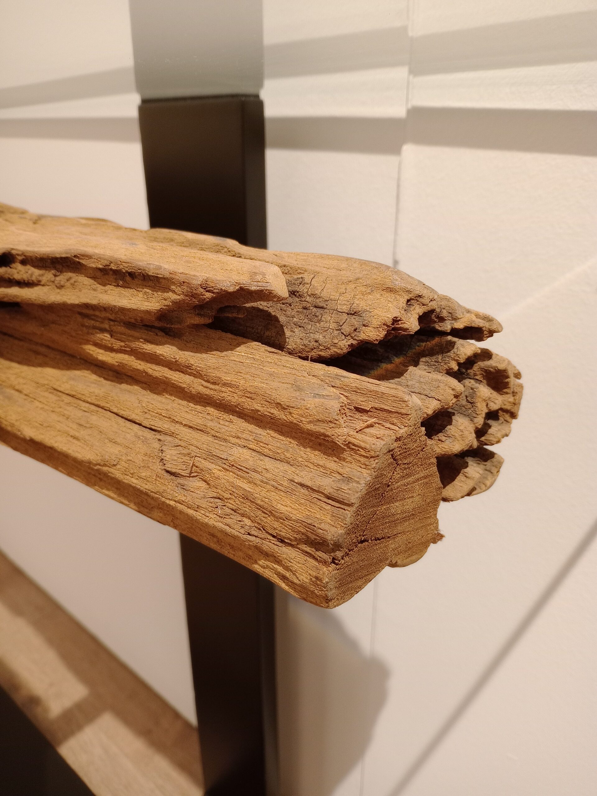 Consola de diseño con una presencia ligera y sofisticada: tapa superior de cristal que deja ver un tronco de madera natural con vetas y relieves auténticos. La combinación de materiales crea un equilibrio perfecto entre calidez orgánica y estética contemporánea, ideal para recibidores, pasillos o como pieza protagonista detrás del sofá. La estructura metálica en acabado negro aporta firmeza y un aire industrial elegante, mientras que el cristal potencia la sensación de amplitud y luminosidad.