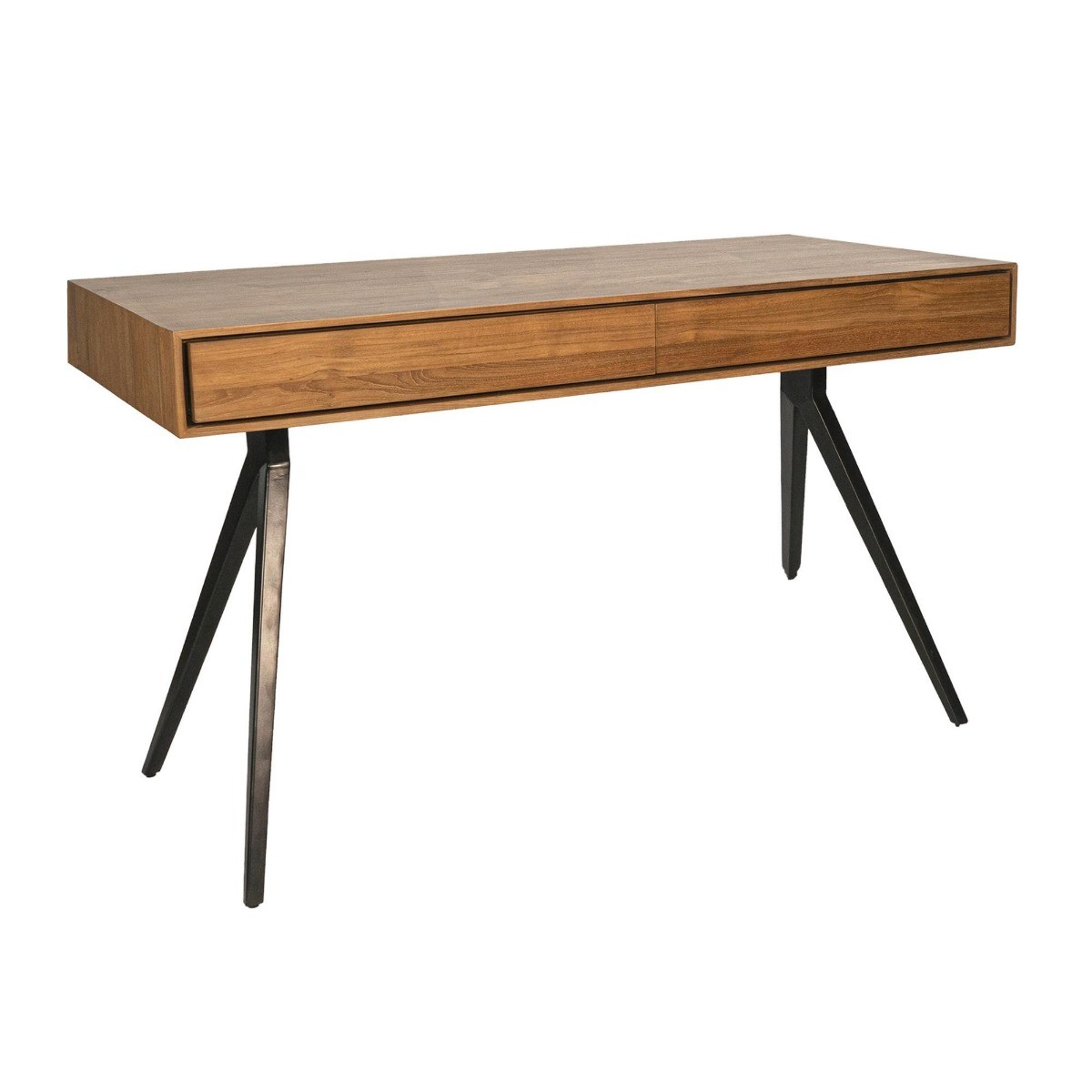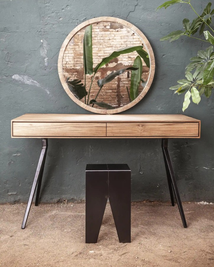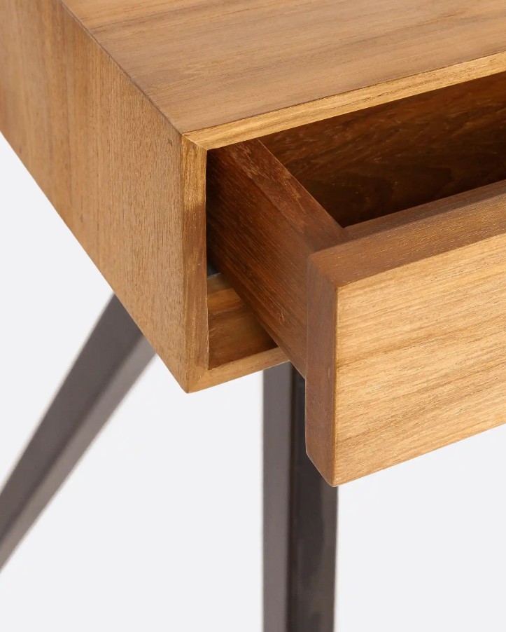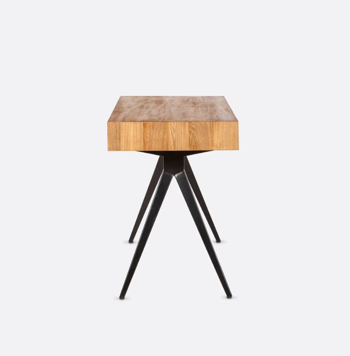Escritorio Majesti de madera de teca reciclada y hierro 130 x 55 x 76 cm en color natural. Majesti se distingue por su diseño que combina robustez y ligereza visual. Las piezas de esta colección presentan sobres de madera de teca reciclada con un borde biselado que reduce visualmente su grosor, aportando una estética más esbelta. Las bases metálicas, con sus características patas en forma de V invertida, brindan estabilidad y un toque contemporáneo. La madera de teca reciclada utilizada en su fabricación proviene de antiguas construcciones en desuso, reflejando el compromiso de dareels con la sostenibilidad y el respeto por el medio ambiente.