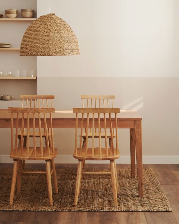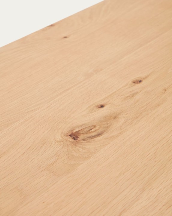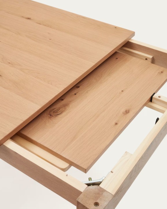 Las patas de roble macizo en acabado natural le otorgan firmeza y un aire artesanal, mientras que su extensión de 60 cm, guardada de forma discreta en el interior, permite ampliar el espacio con facilidad para recibir más invitados.