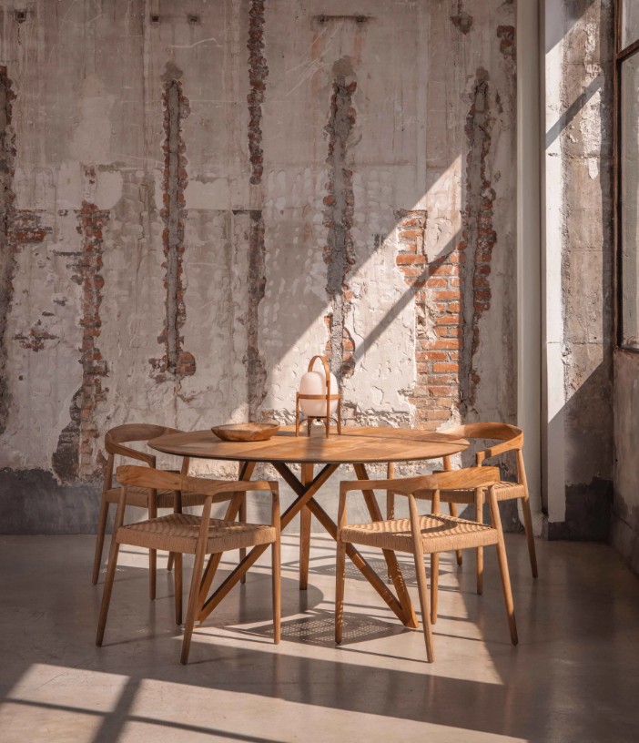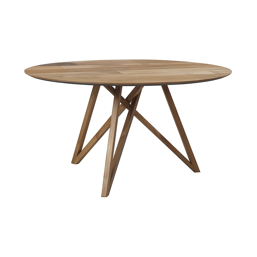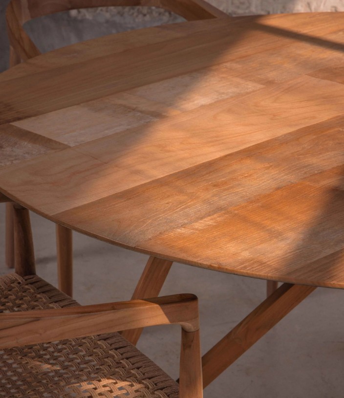 Mesa redonda Spider fabricada en teca maciza reciclada, con un diseño moderno y estructura geométrica que aporta ligereza visual y estabilidad. Su acabado natural resalta la calidez y textura de la madera, convirtiéndola en una pieza elegante y sostenible ideal para cualquier espacio. Medidas: 120 × 75 cm.Opción medida de 120 x 75 cm.