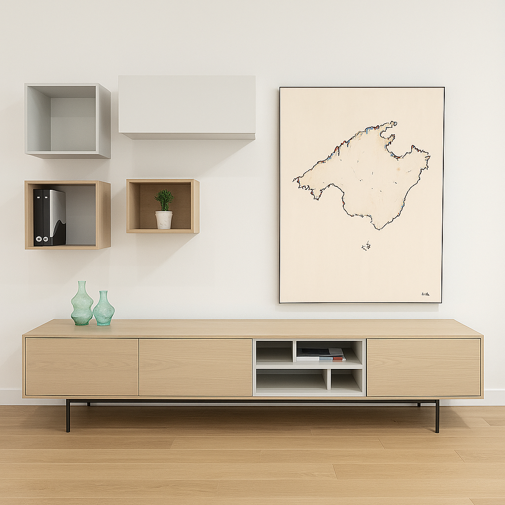 Mueble T.V. con patas metálicas altas lacadas en color negro. Dispone de dos puertas batientes, módulo diáfano con separador y dos cajones. Chapa natural de Roble acabado talco.