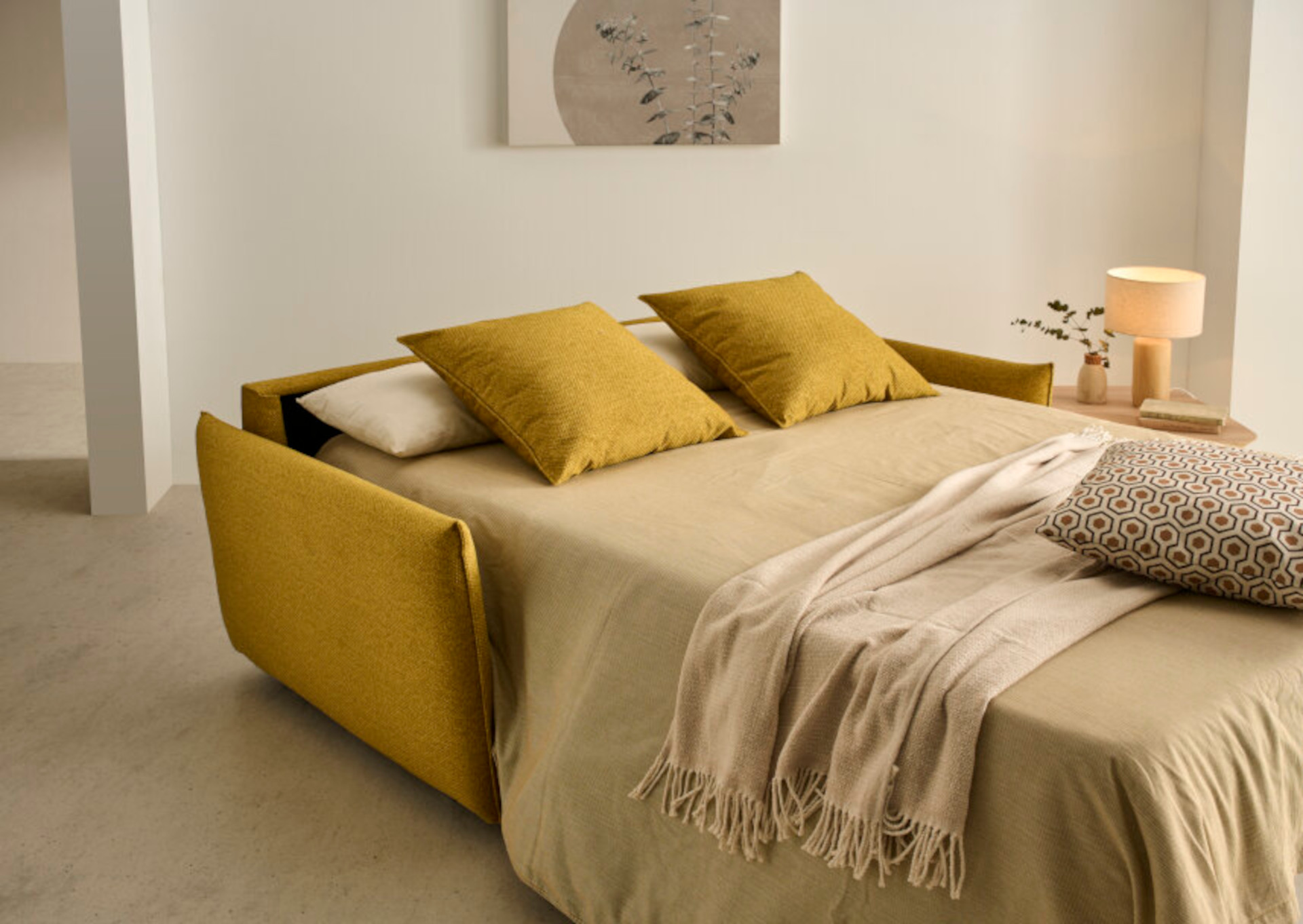 Equipado con un mecanismo interno metálico antioxidante, pintado con acabado epoxi y resina, este sofá cama asegura durabilidad y resistencia al uso diario. El somier metálico, elaborado con malla electrosoldada, está unido al mecanismo mediante muelles y cinchas elásticas en la zona del asiento, proporcionando una suspensión óptima en ambas zonas, tanto en modo sofá como en cama. Totalmente desenfundable. Varios acabados a elegir.